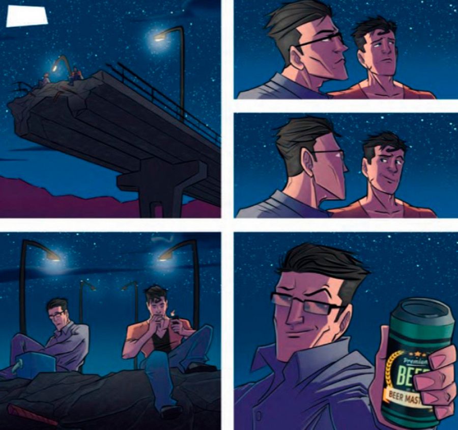 “El tebeo gira en torno a 5 protagonistas –añade-. Bueno, cuatro y medio en realidad. Carlos, Bruno, Esteban, Víctor y Alex. Carlos, Bruno y Esteban son el trío que lo controla todo, y Víctor y Alex los dos rebeldes que quieren acabar con el sistema. Cada uno representa un personaje icónico del mundo superheroico y creo que es muy fácil descubrir quién es quién. Por ejemplo, Carlos es Superman. Los demás se los dejo a los lectores. Es un pequeño juego que a mí siempre me ha gustado mucho resolver en los tebeos de realidades paralelas y visiones alternativas. Reconozco que el papel de Alex es bastante circunstancial, pero creo que los otros cuatro tienen personalidades muy marcadas y acordes con lo que luego van haciendo en el cómic”.